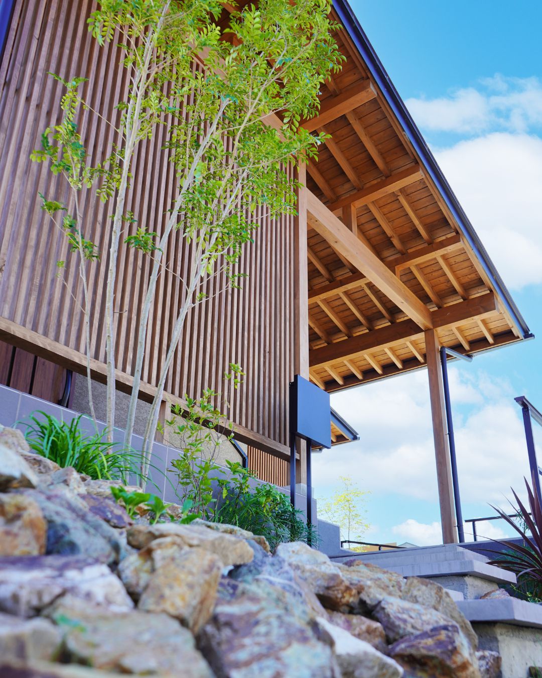階段の周りにはナチュラルな色合いのゴロタ石を積み上げ、