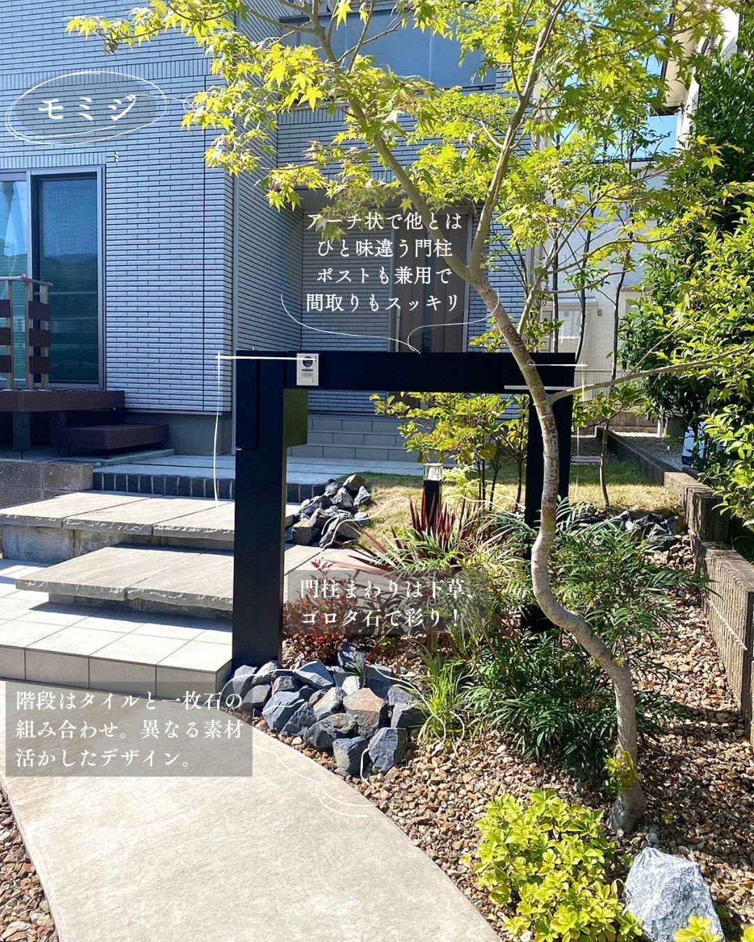アーチ状の門柱にゴロタ石と下草で彩り、