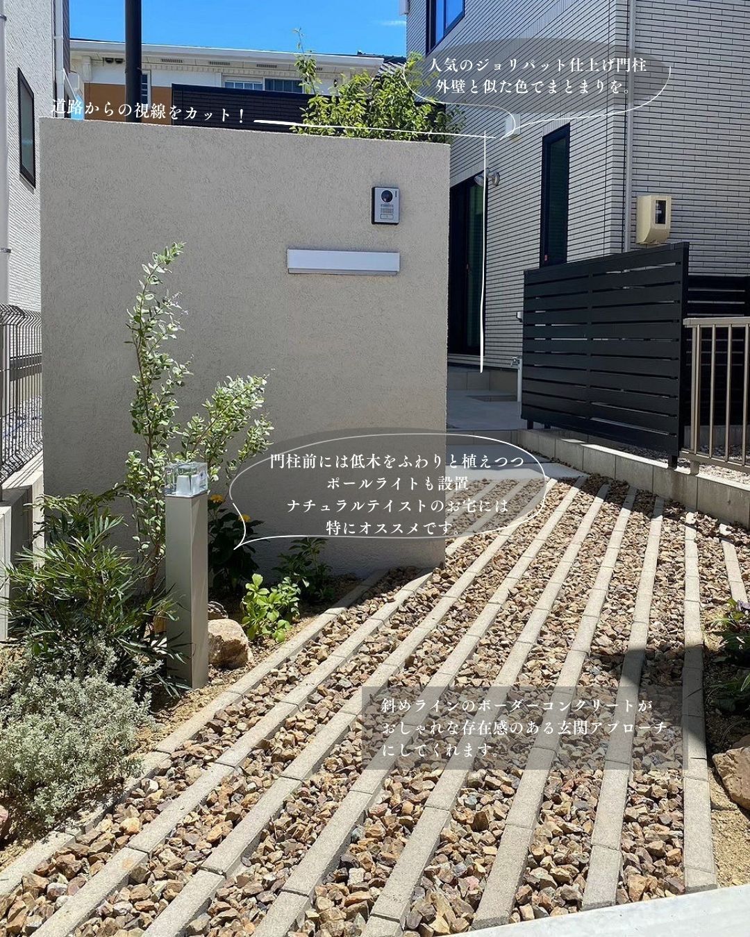 道路からの目線カットにもなる門柱は、人気のジョリパット仕上げ。