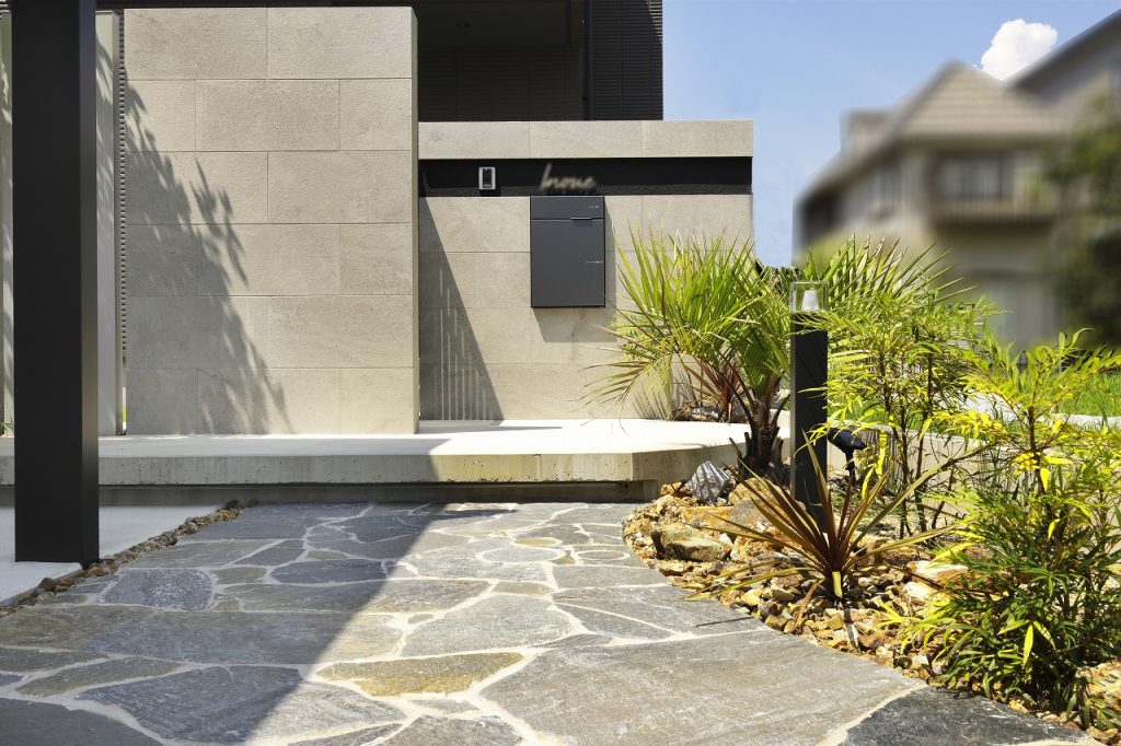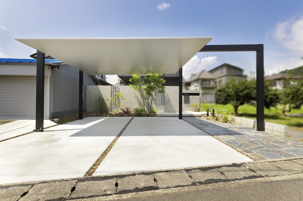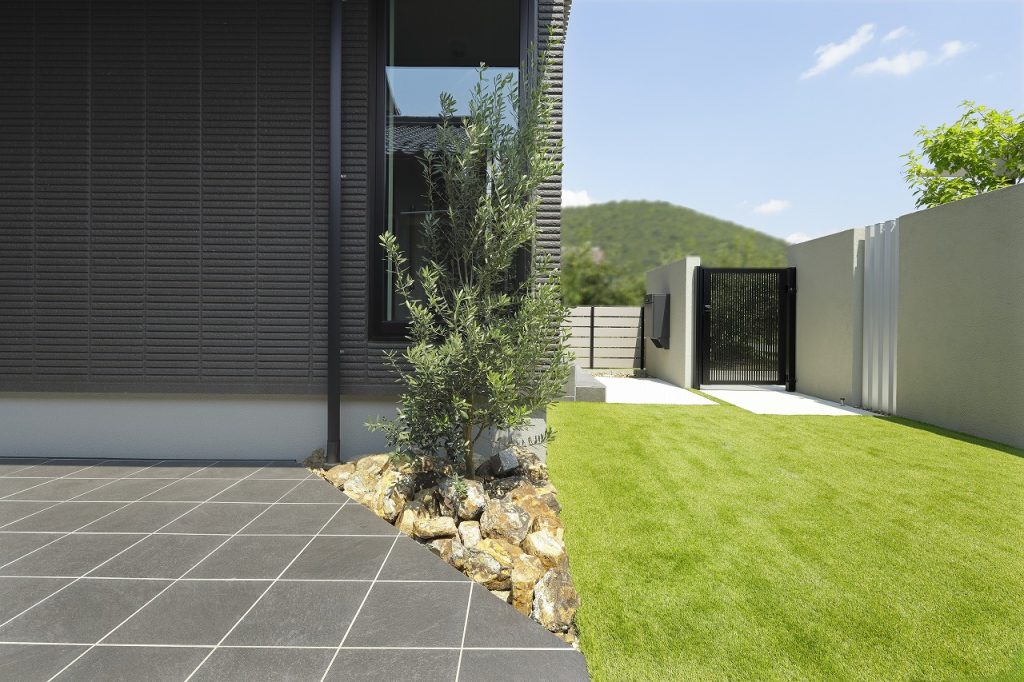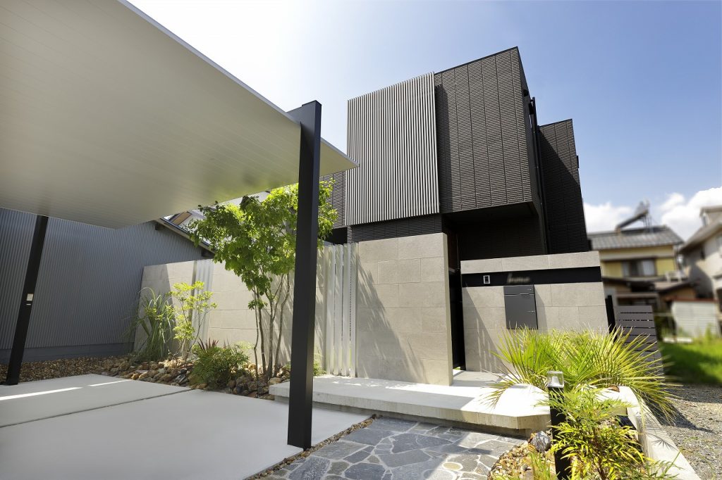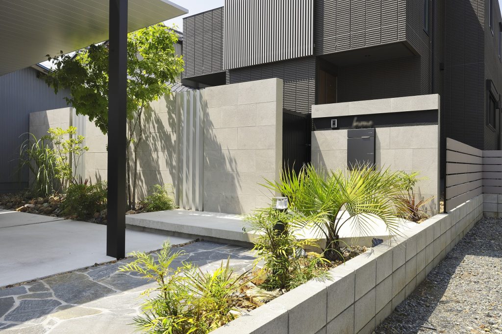 SCカーポート、タイル仕上げの門柱、目隠し壁、石畳みのアプローチ、タイルデッキなど 人気のアイテムを取り入れた誰もが憧れる外構デザインをご紹介いたします