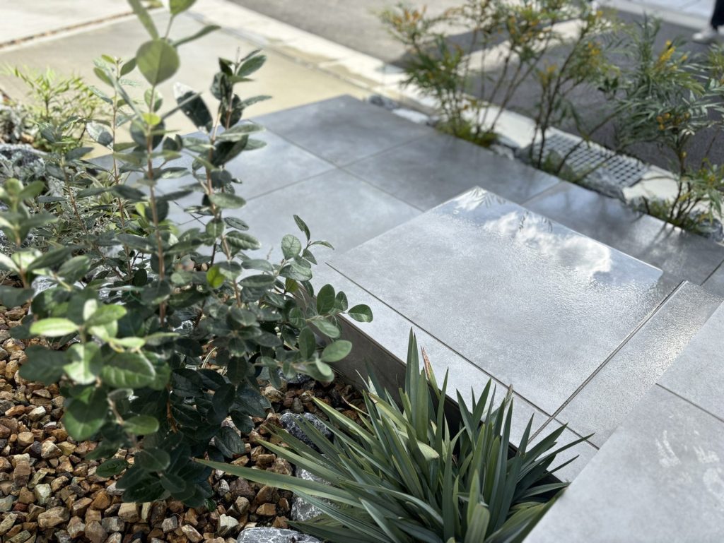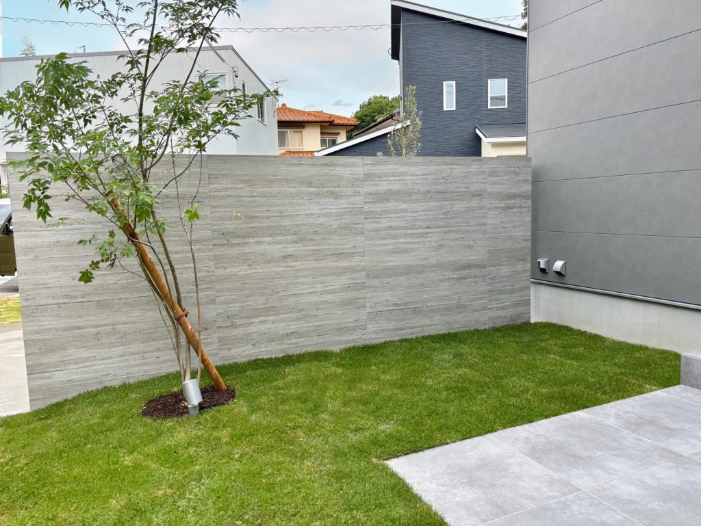 シンプルかつ高級感のあるモダンな外構デザインを追求しました。 プライバシーを考慮した目隠し壁には、スタイリッシュさと温かみを両立 モダンな雰囲気を壊さずに、より全体を引き立てられるデザインになっています。
