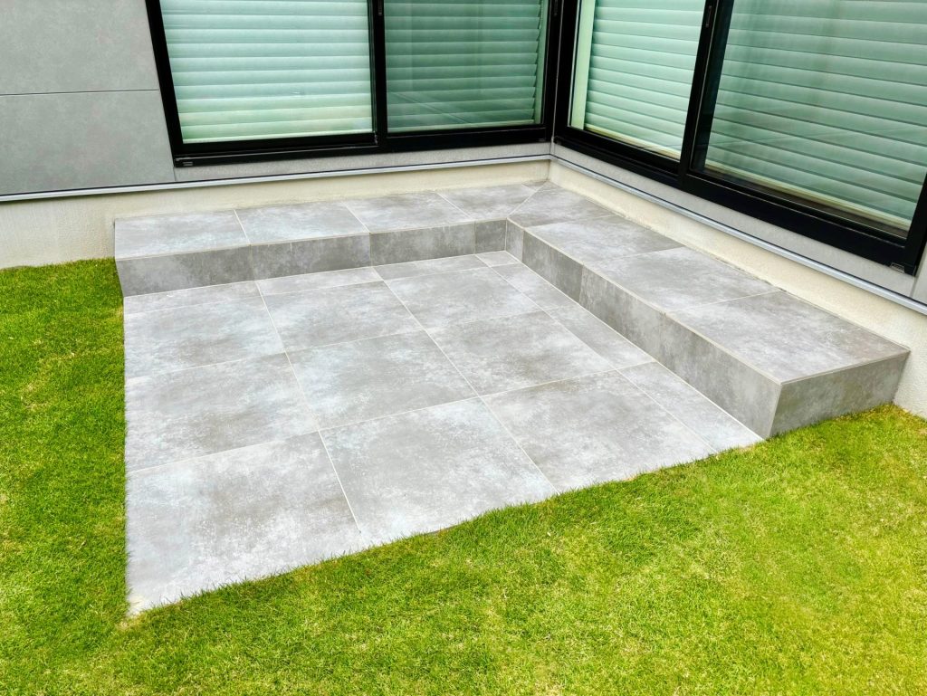 リビング窓からのスムーズな動線を確保するために、タイルデッキにステップを設置。