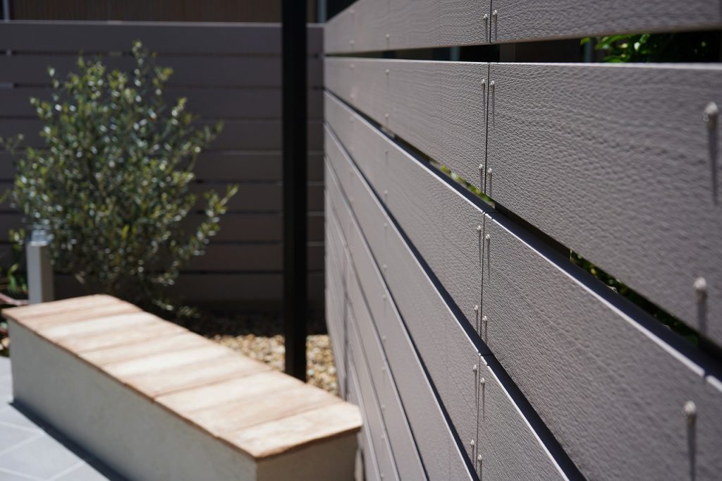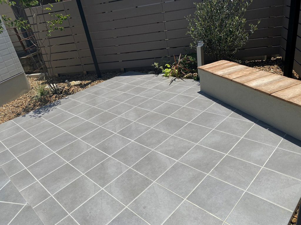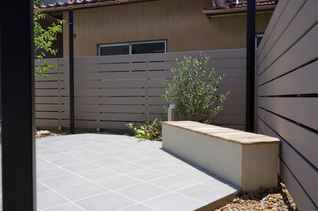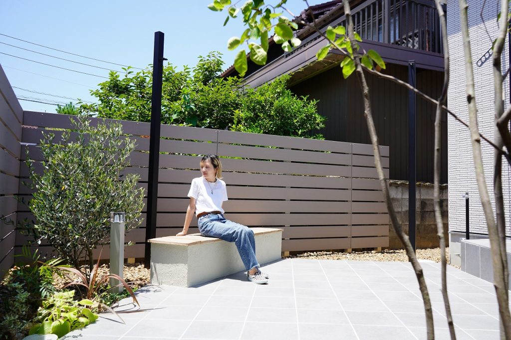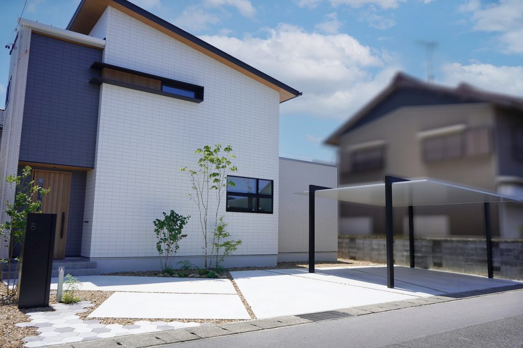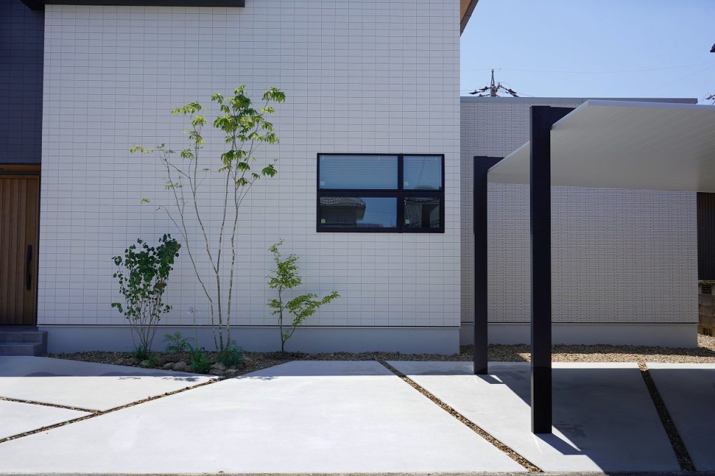 駐車場のコンクリートは、単なるスリットではなく形に変化をつけることで シンプルながらもデザイン性を感じられる空間に。 実用性を保ちつつ、外交全体に統一感とおしゃれさをプラスしています。