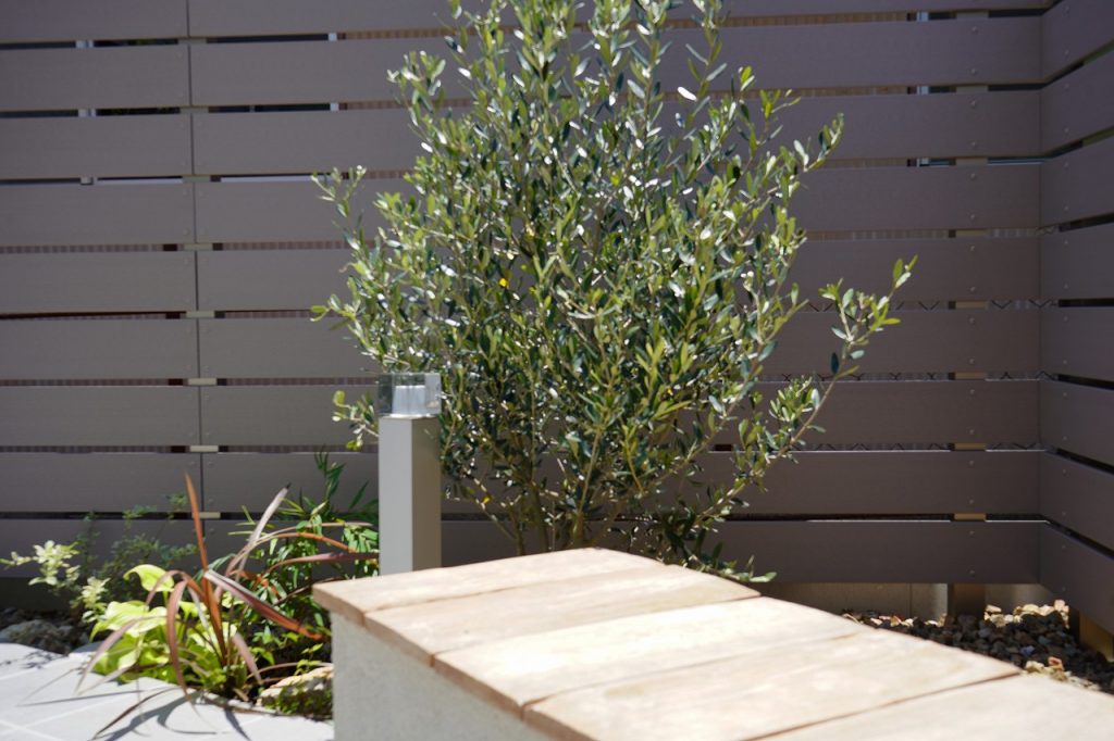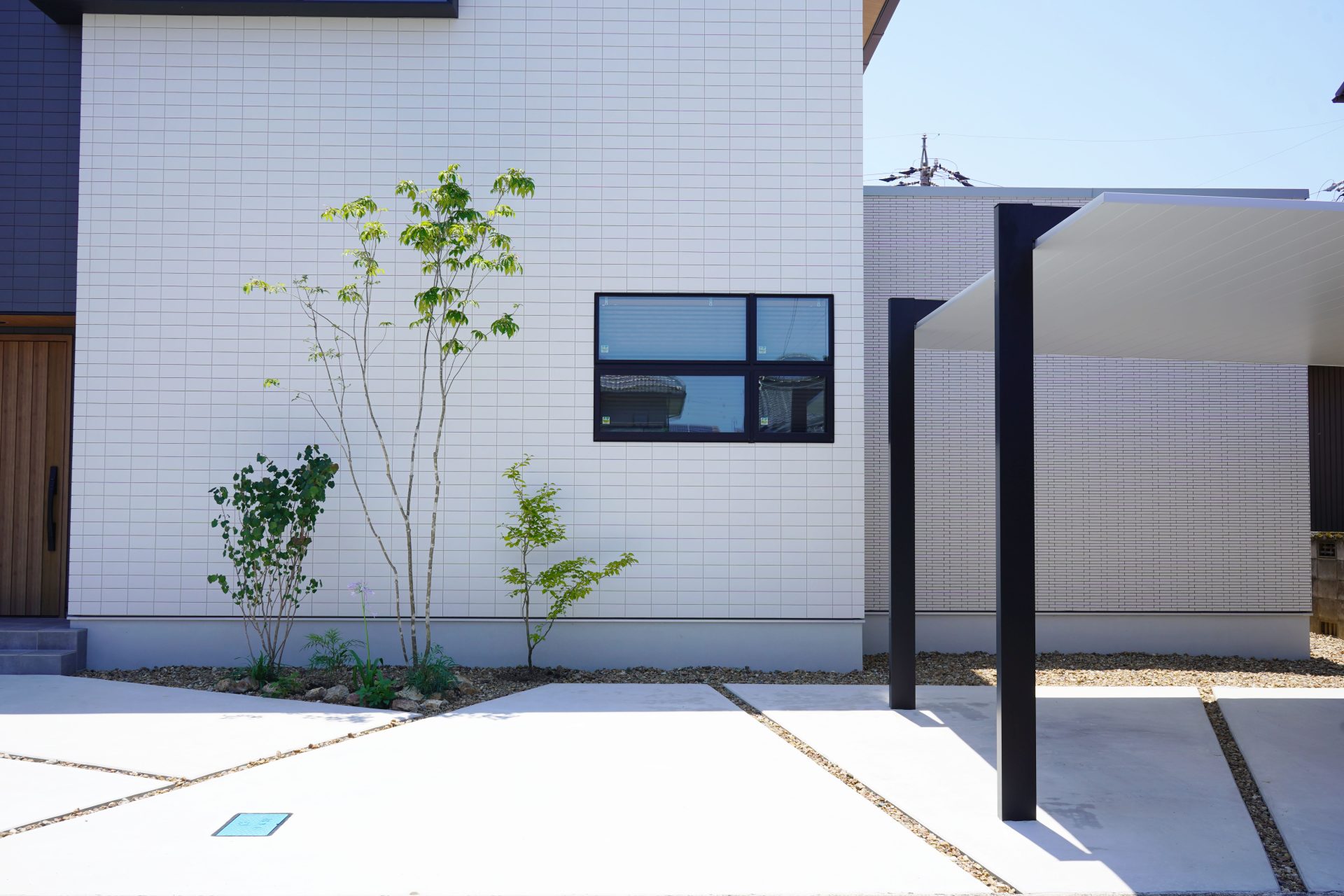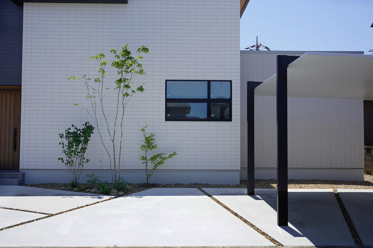 白い外壁に映える植栽の緑と、遊び心のあるデザインを取り入れた外構プラン 玄関アプローチから駐車スペース、中庭まで、 暮らしやすさとデザイン性を両立させたお住まいです。 家族で過ごす時間を大切にしながら、日常にちょっとした楽しさや彩をプラスしました。