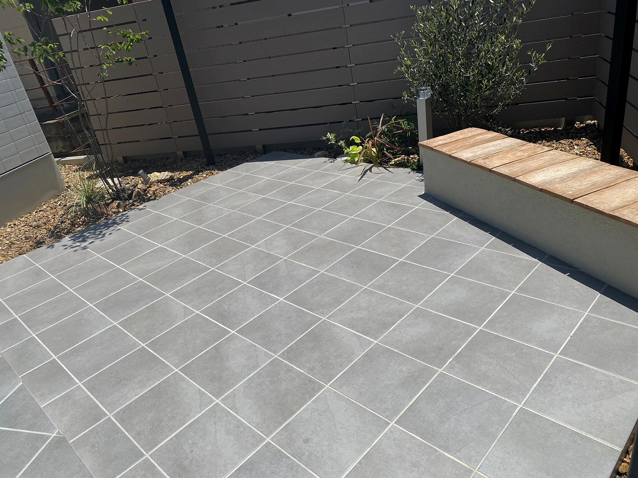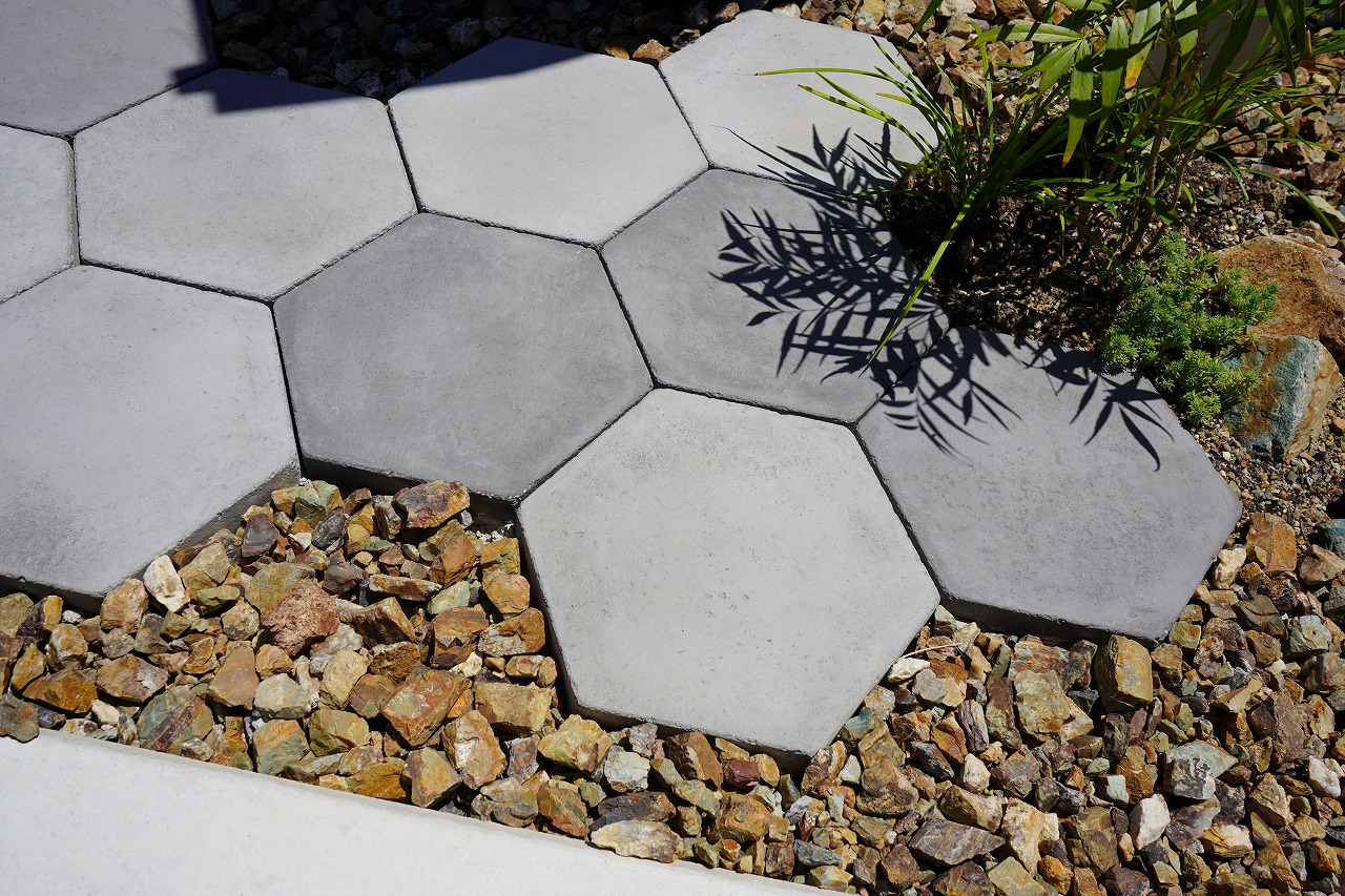 玄関へと続くアプローチには、六角形の平板を3色組み合わせて敷き詰めました。 遊び心のある可愛らしいデザインで、訪れる人を明るく迎えてくれるアクセントに。 白い外壁とのコントラストで、植栽のグリーンもより一層引き立つ仕上がりになっています。