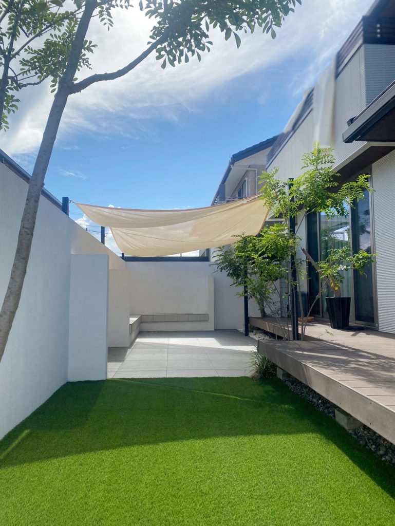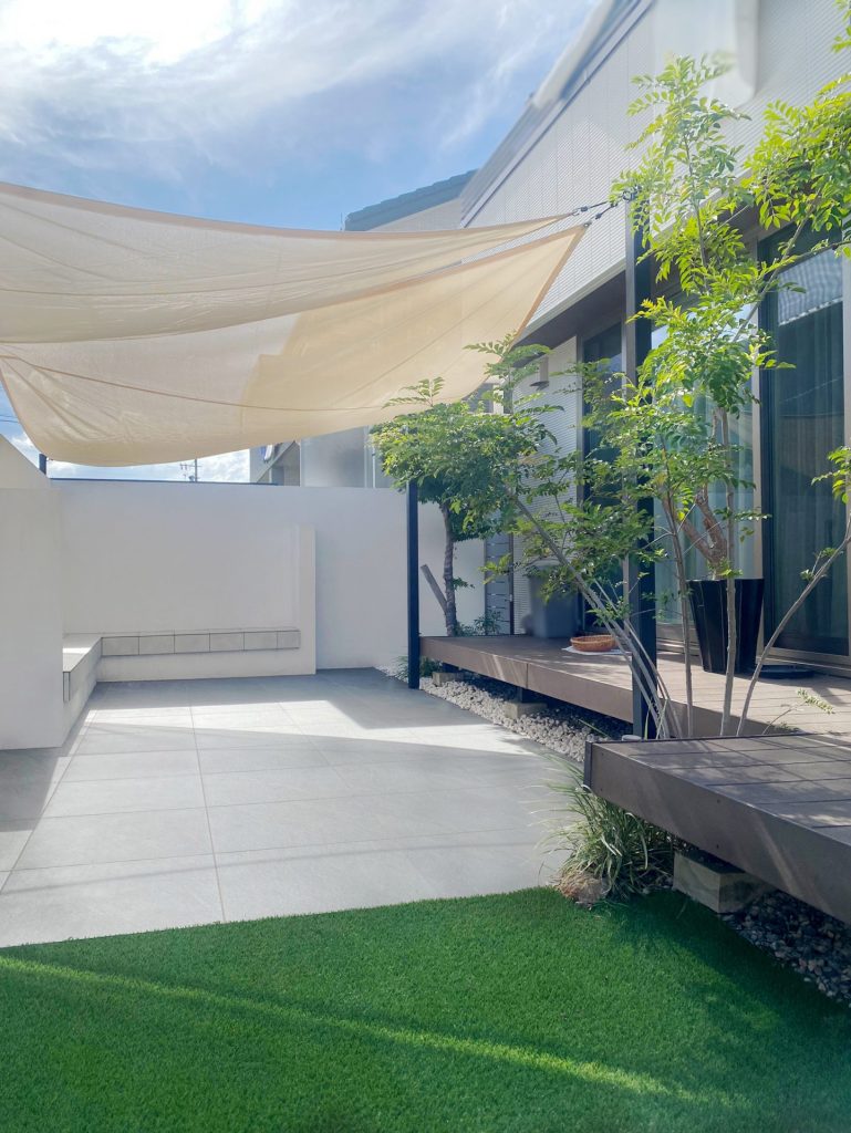 中庭には、人気のタイルデッキやウッドデッキ、人工芝、タープ柱など、多彩なアイテムを取り入れ、