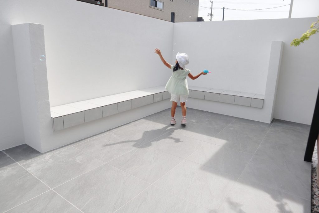 フラット設計で、お子さまたちが安心して遊べる庭に