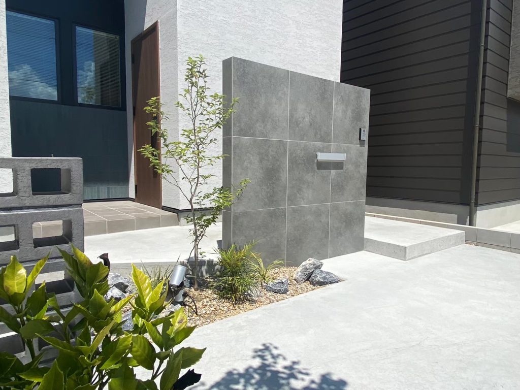 玄関前には、グレー系タイルで仕上げた門柱を設置