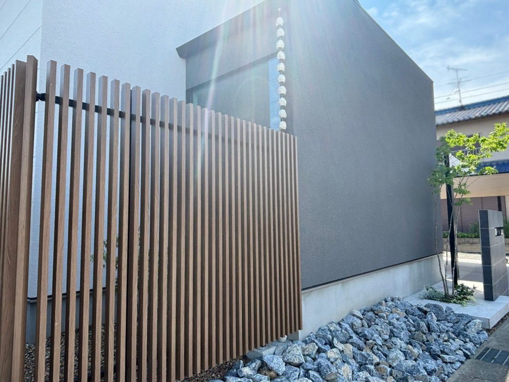 道路側には木調の格子フェンスを設置。外部からの視線はしっかり遮りながらも、