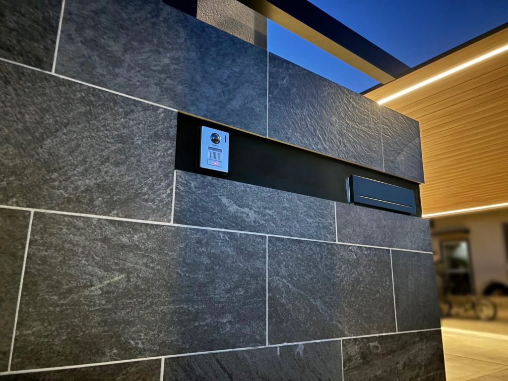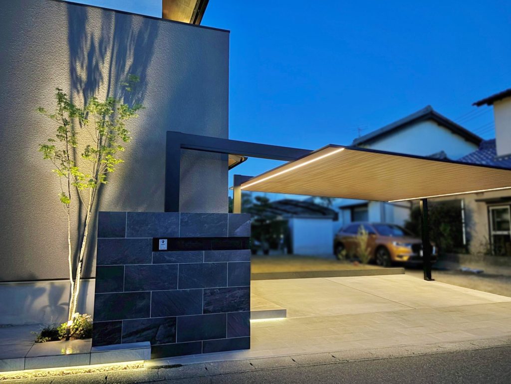 SCカーポートの梁延長と連動した構成で、外構全体が統一感と高級感を持つ玄関先へと仕上がっています。