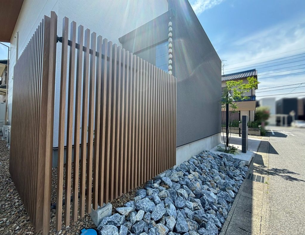 道路側には木調の格子フェンスを設置。外部からの視線はしっかり遮りながらも、