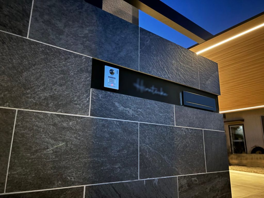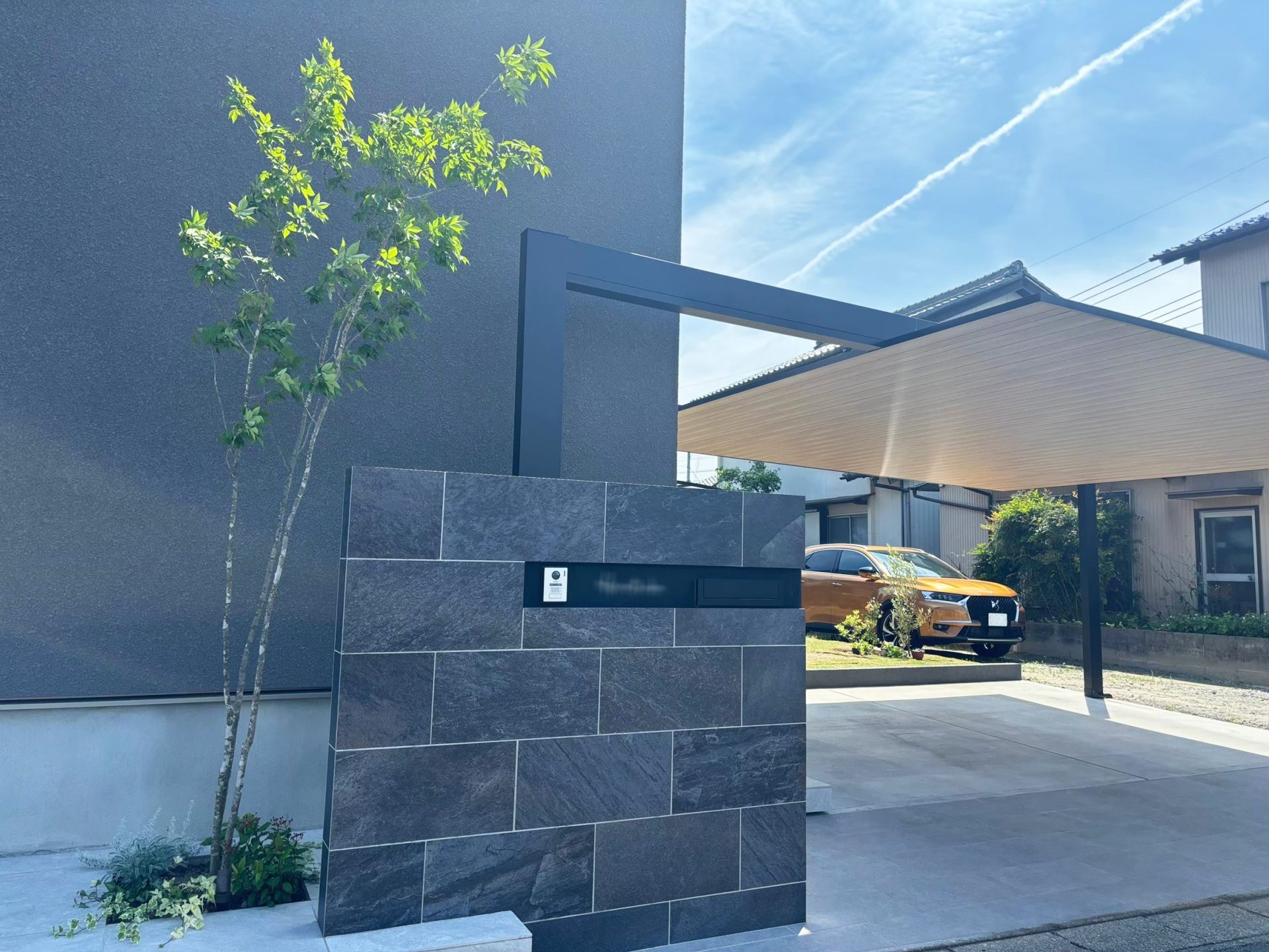 SCカーポートの梁延長と連動した構成で、外構全体が統一感と高級感を持つ玄関先へと仕上がっています。