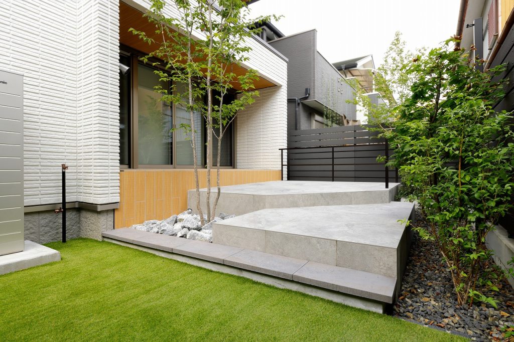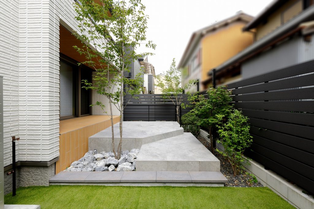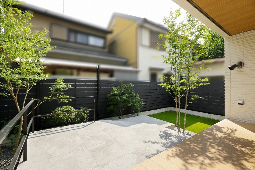 中庭には広々としたタイルデッキを設け、リビングとのつながりを意識した設計です。