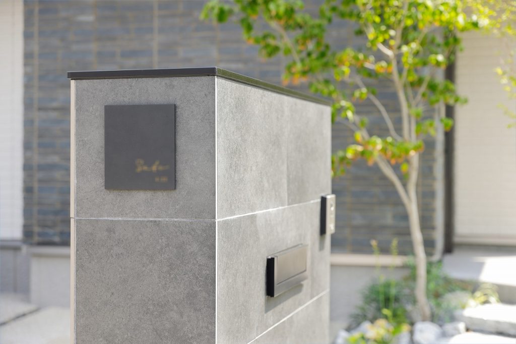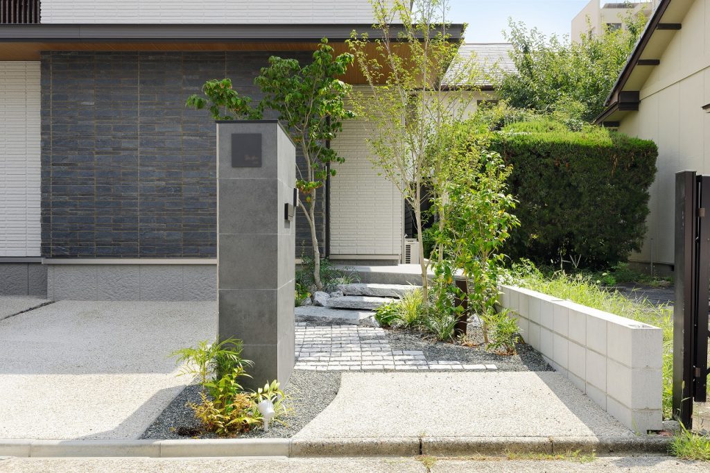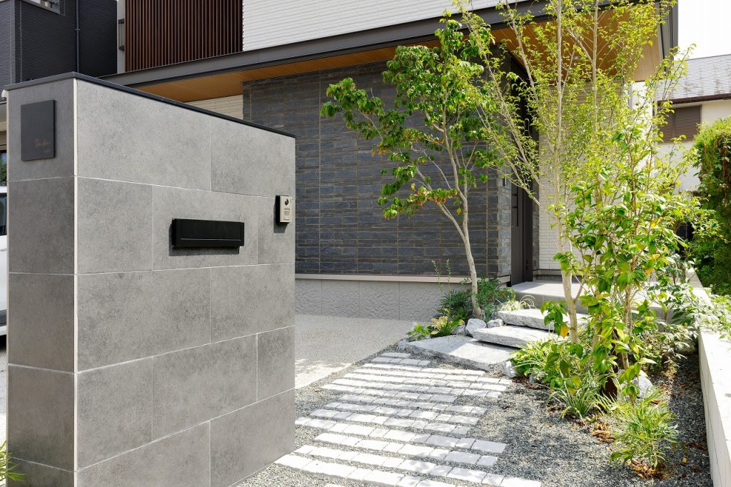 門柱はタイル仕上げで、和の雰囲気を壊さないようなグレーのカラーを採用