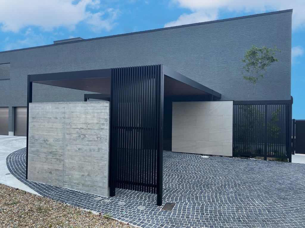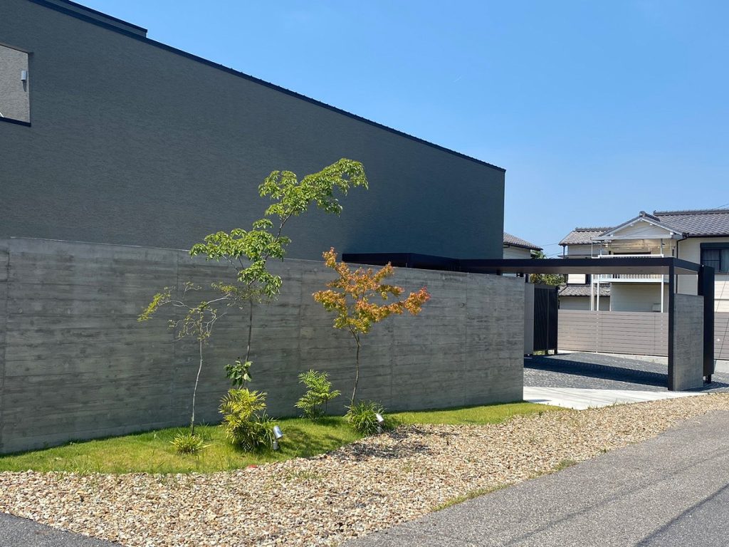 ゲート横の壁には、1200×600mmの大判タイルを使用。