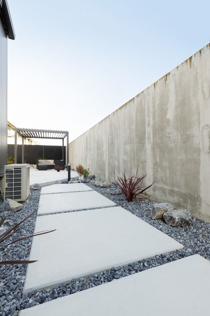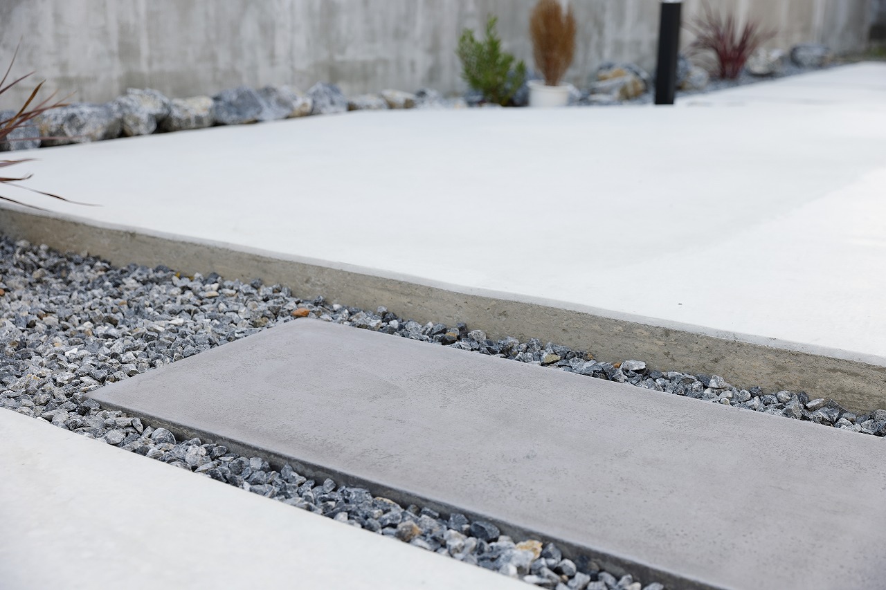 ロックガーデンの雰囲気になじむ、コンクリート仕上げの広いテラス