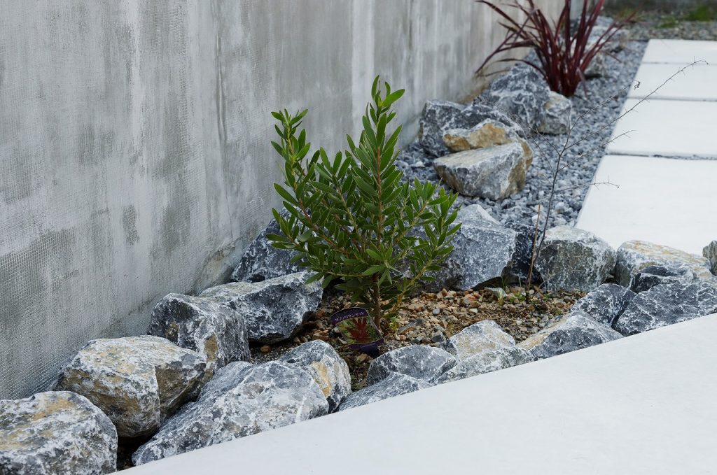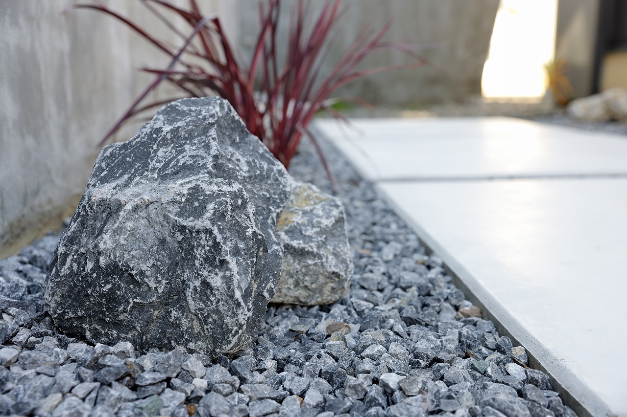 石や砂利との相性を考えた植物選びにより、ナチュラルでありながらもスタイリッシュな雰囲気が生まれています。