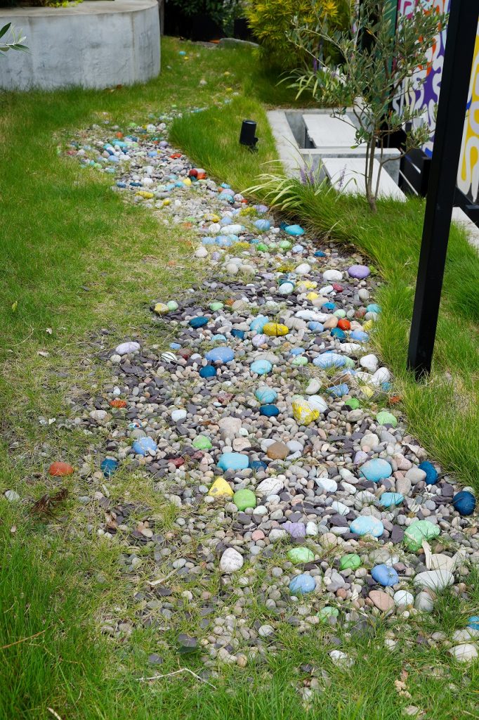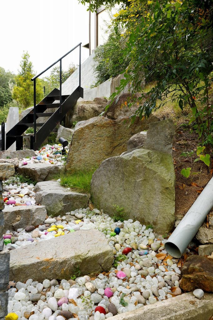 色をつけた丸石たちが、湾曲アプローチの形を表現しています。