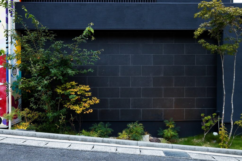 コンクリート面積が多い場所の事情から、シンボルツリーの高木や植栽、シックなタイルを使用する事で目線を上に。