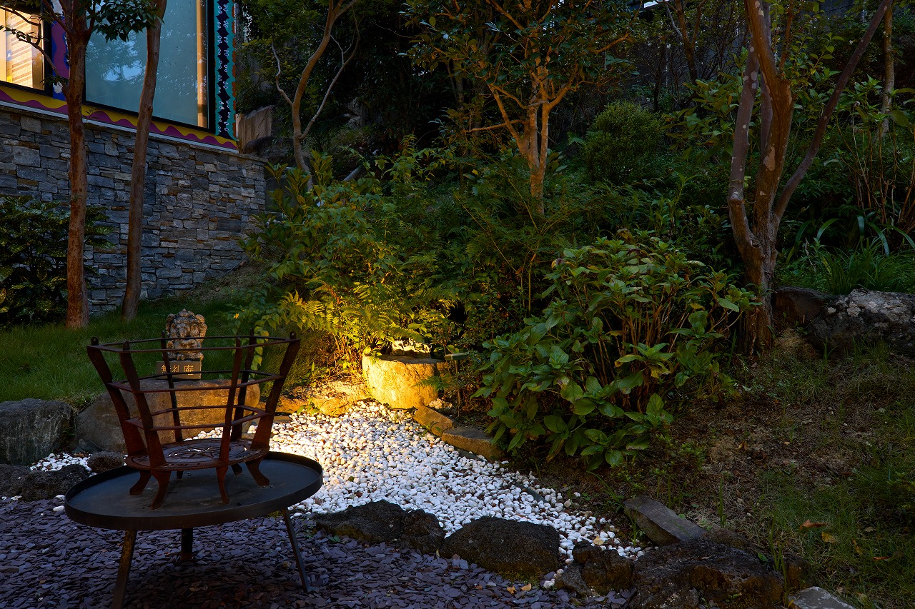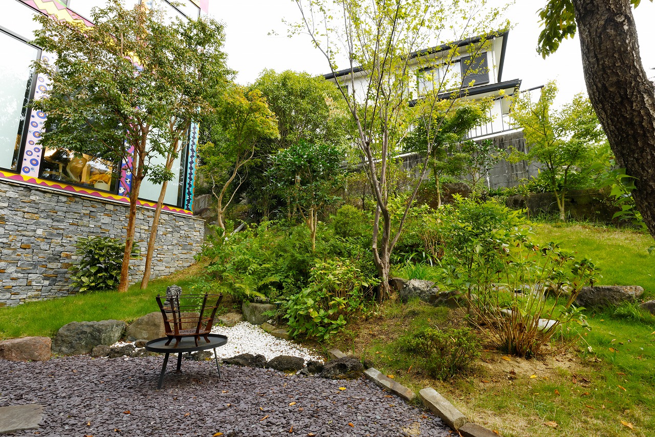 オリジナル鉄骨階段を下ると、色鮮やかな庭とは一変