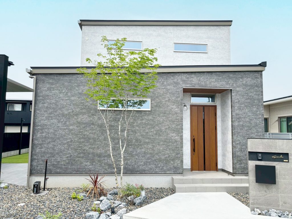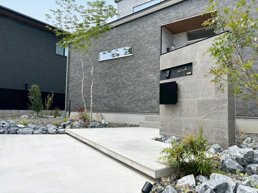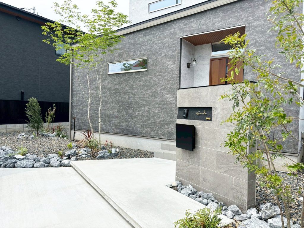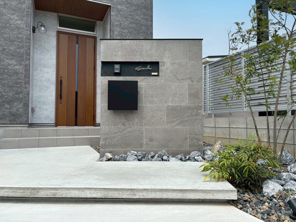 門柱は人気のグレータイル仕上げ。