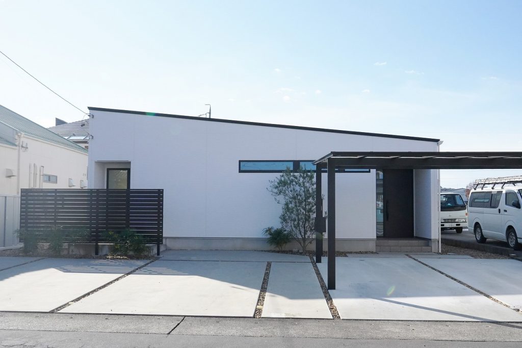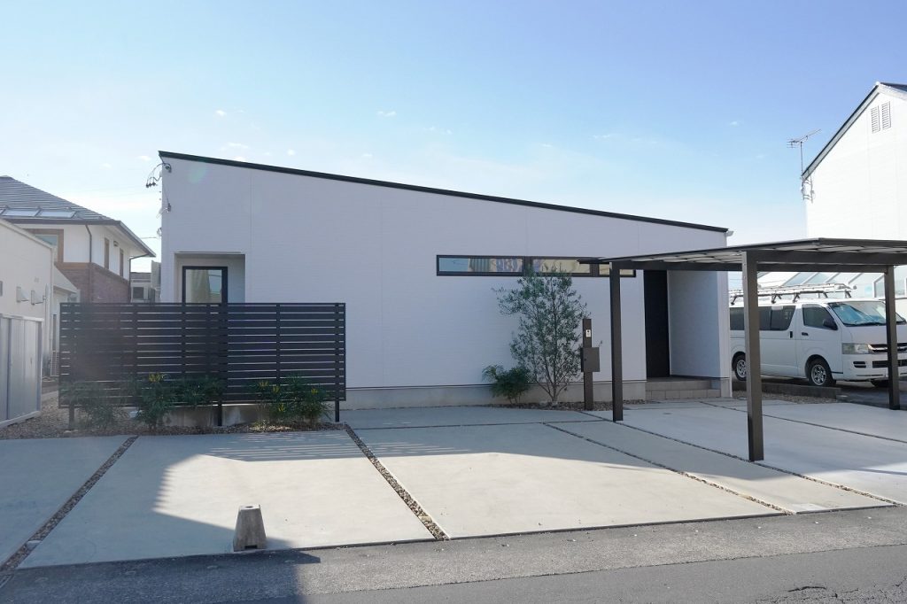 平屋の外構デザインをご紹介 建物の美しい水平ラインを活かすため、全体をシンプルモダンなデザインで統一しています。