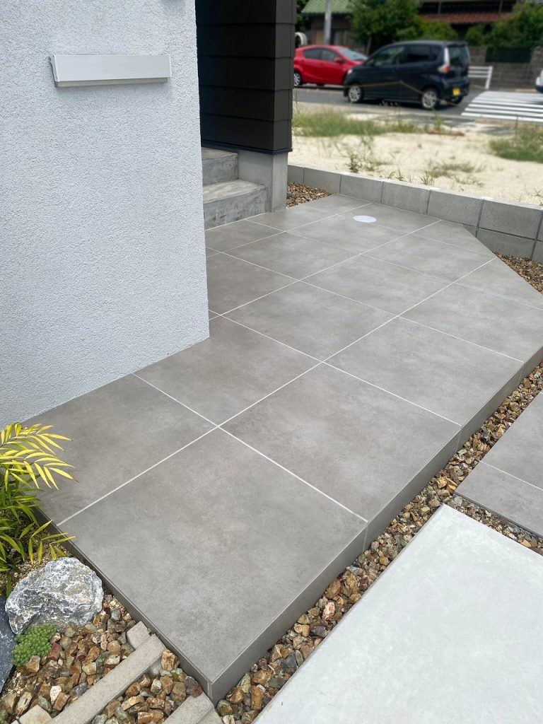 アプローチも同様に600角タイルとリビオを組み合わせ、