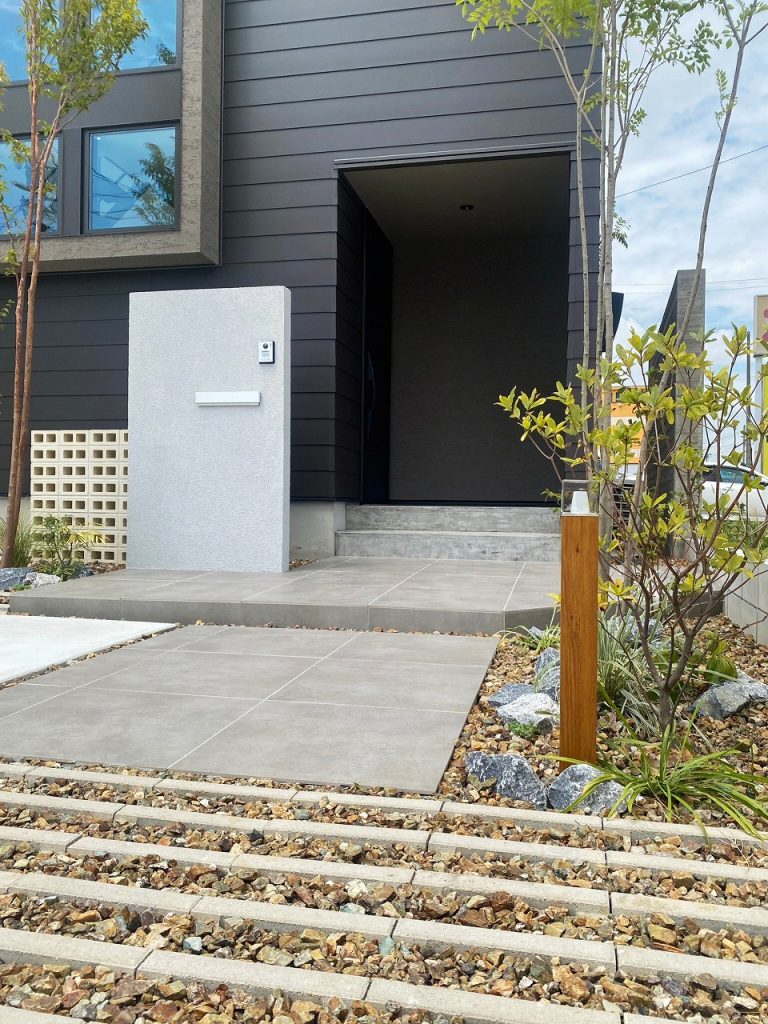 600角の大判タイルを使用した玄関ポーチとアプローチが、広がりのある上質な印象を演出。 明るい外構カラーとシンボルツリーのシャラが、建物と美しく調和するデザイン外構です。