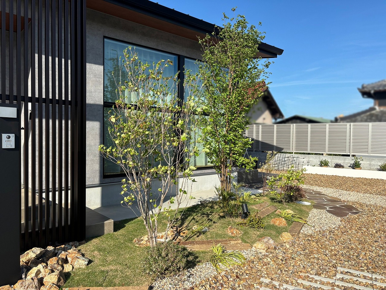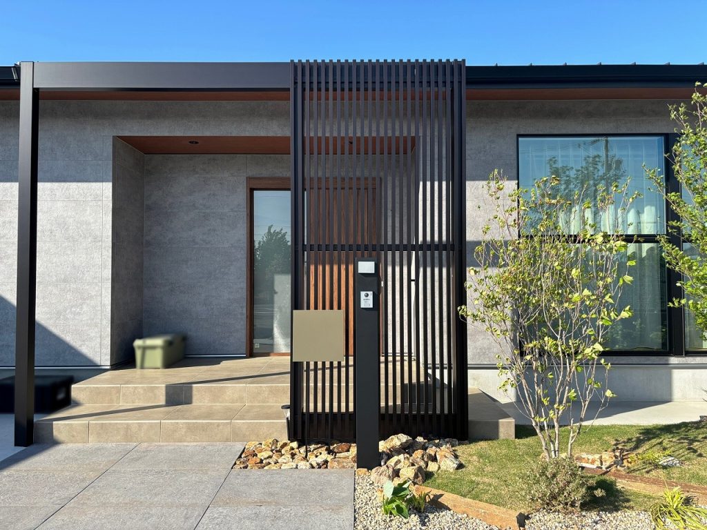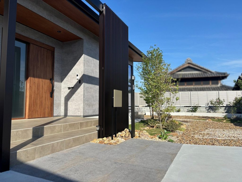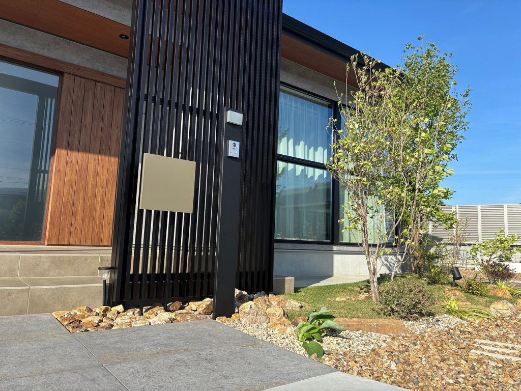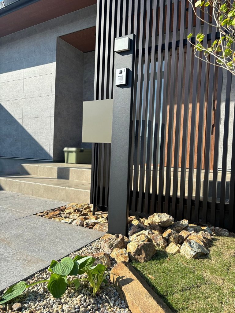 リレーリアスクリーンと600角タイルが映えるシックなエントランス 目隠しフェンスでプライベートを確保し、 中庭には天然芝や乱形石を用いた自然素材あふれる外構デザインです。