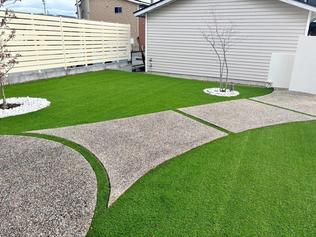 玄関アプローチは、天然芝から人工芝へ変更し、日々の管理を軽減。