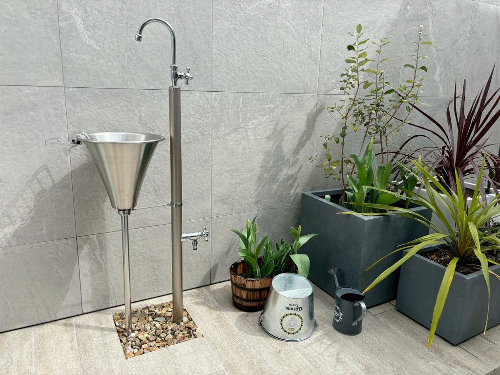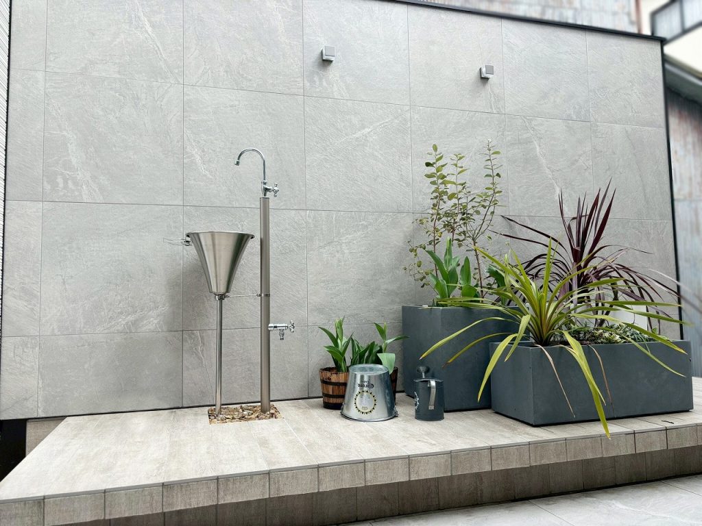 中庭にはスタイリッシュなステンレス水栓を設置し、