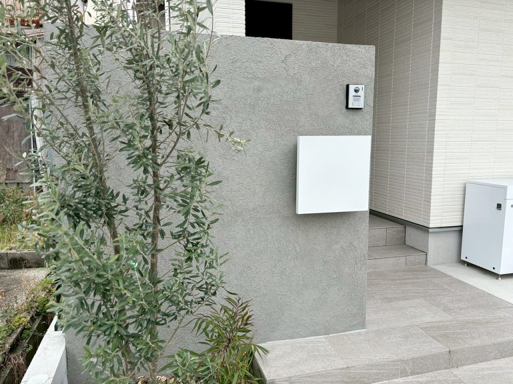 ジョリパット仕上げの門柱は建物の外観に合わせてグレーを採用