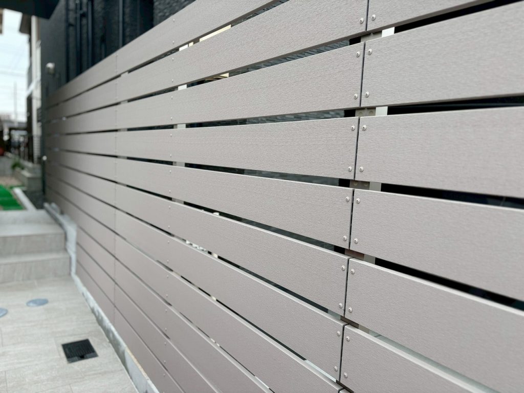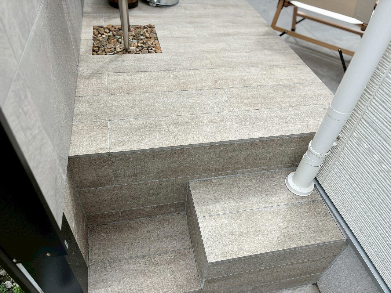 600角の大判タイルで高級感を演出し、天端には笠木を設置することでデザイン性もアップ