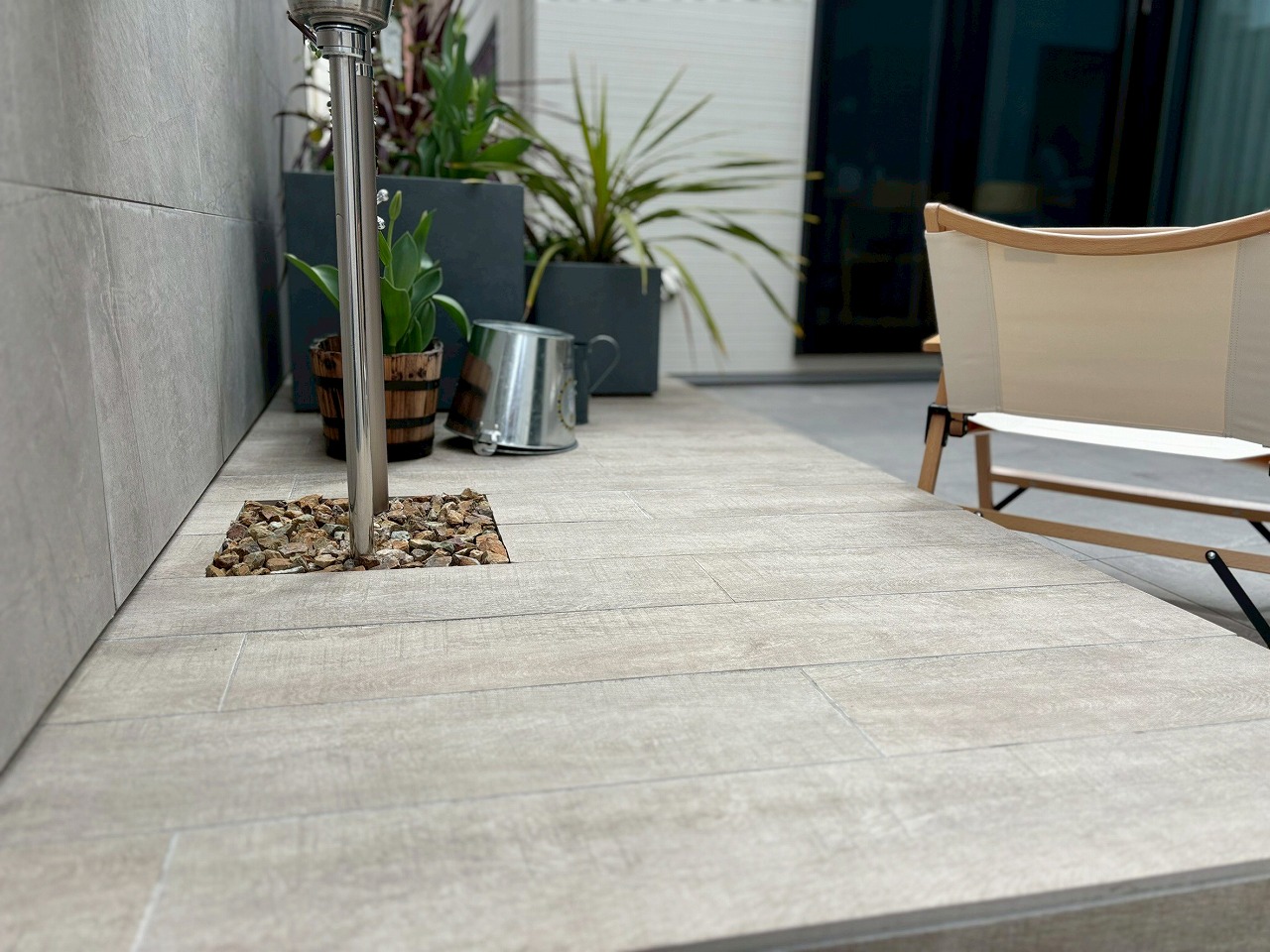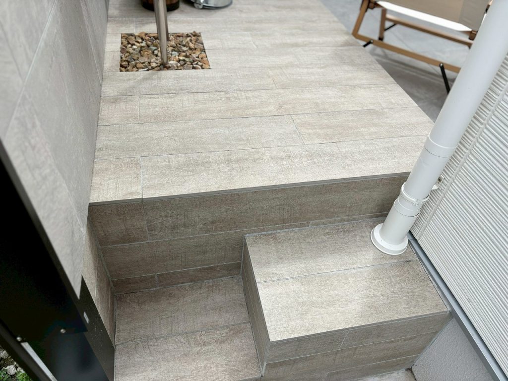 タイルデッキを主役に、目隠し壁と植栽で上質な中庭をデザイン 機能性と美しさを両立し、家族でくつろげるプライベート空間にしました。