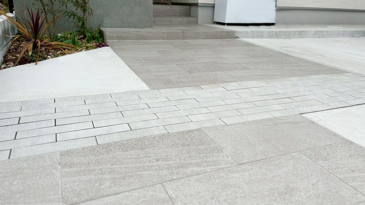 玄関アプローチはタイルと石材【エクレル】を組み合わせ、