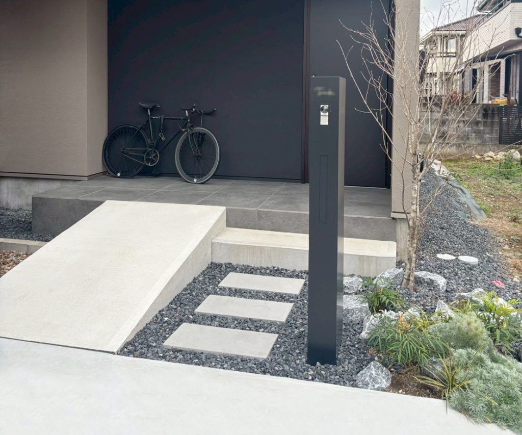 賢くつくる、でもしっかり素敵な外構 旗竿地という条件、そしてコストパフォーマンスを考えた外構でありながら、 デザイン性・機能性・暮らしやすさのバランスがとれた外構に仕上がりました。